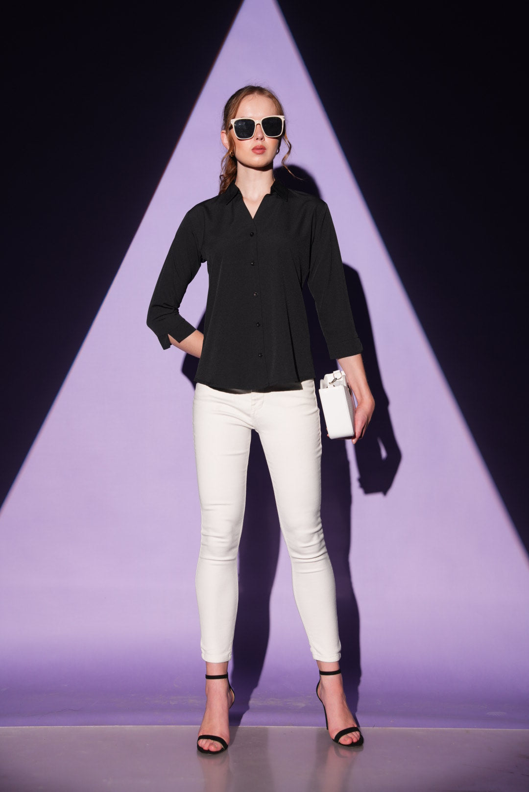 This Formez shirt features a classic spread collar and button-down front for a professional look. The three quarter sleeves are perfect to pair with your favorite jeans, leggings, shorts etc.. Mindful, wellness theme graphics inspire positive energy.