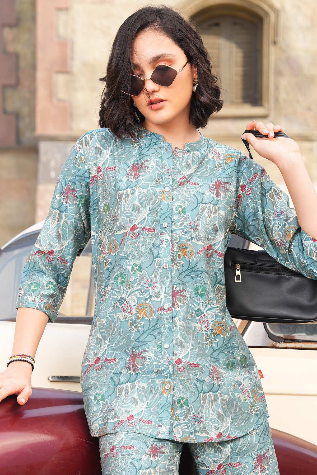 Pale Aqua-Colored Printed Co-Ord Set